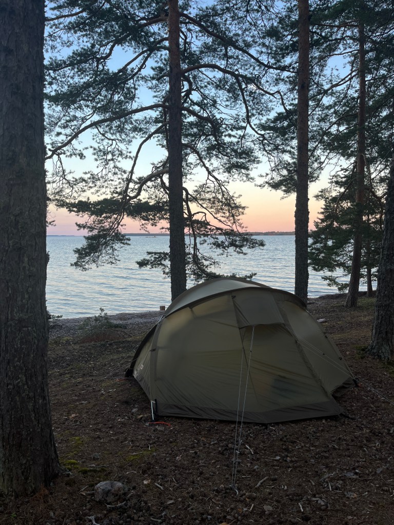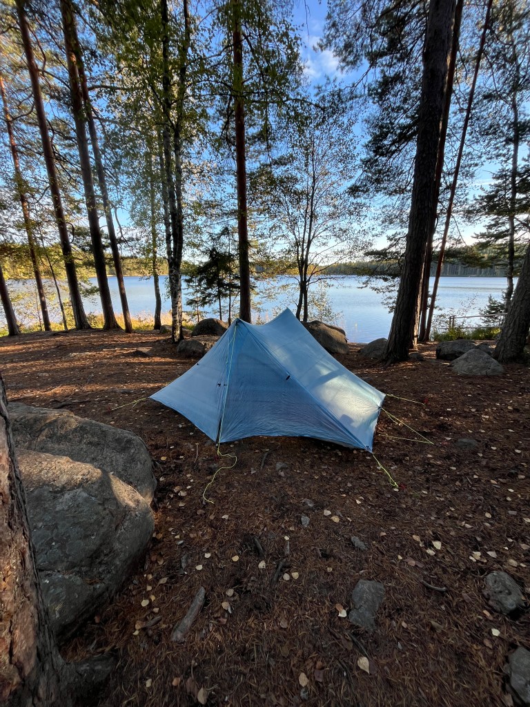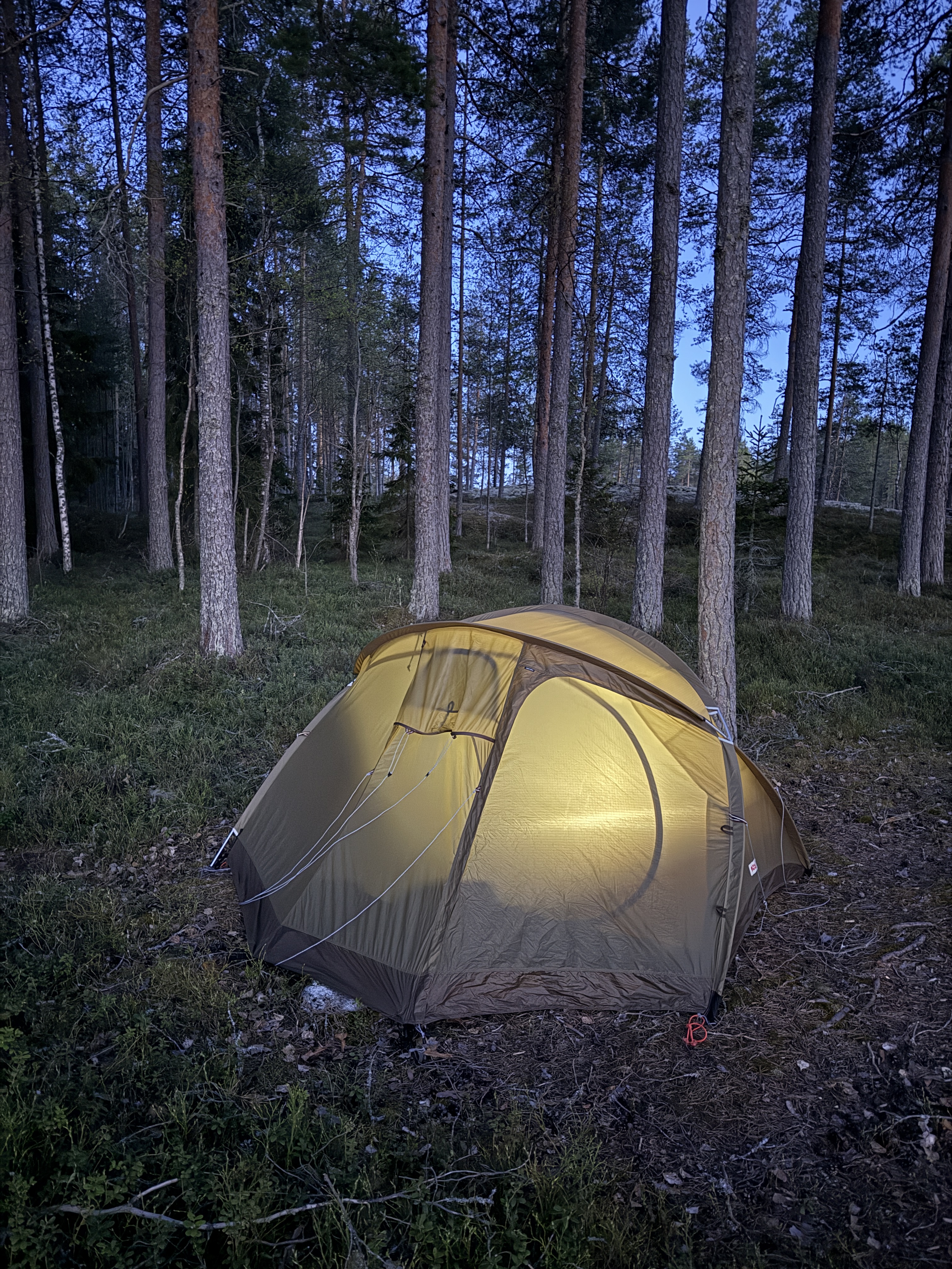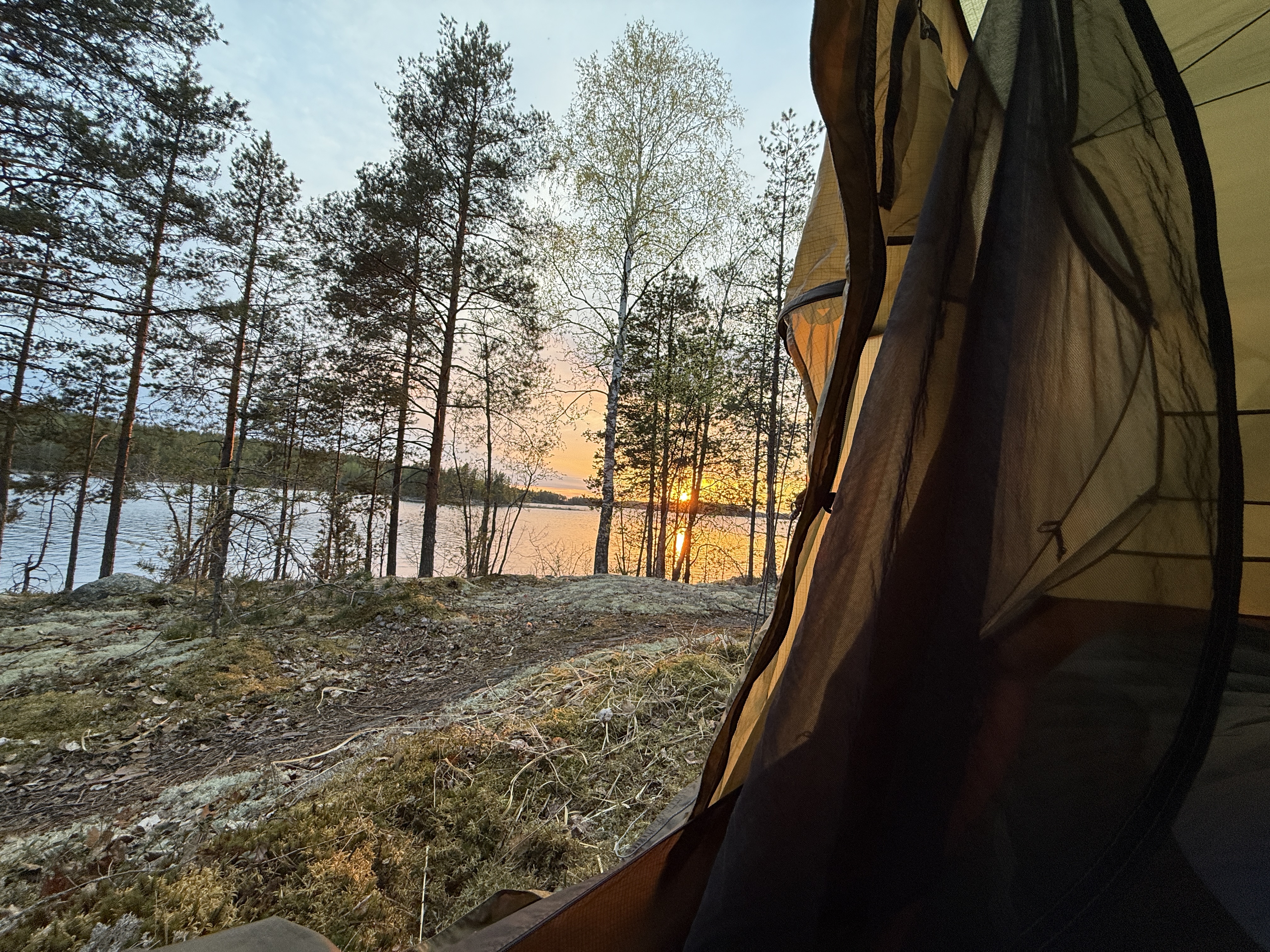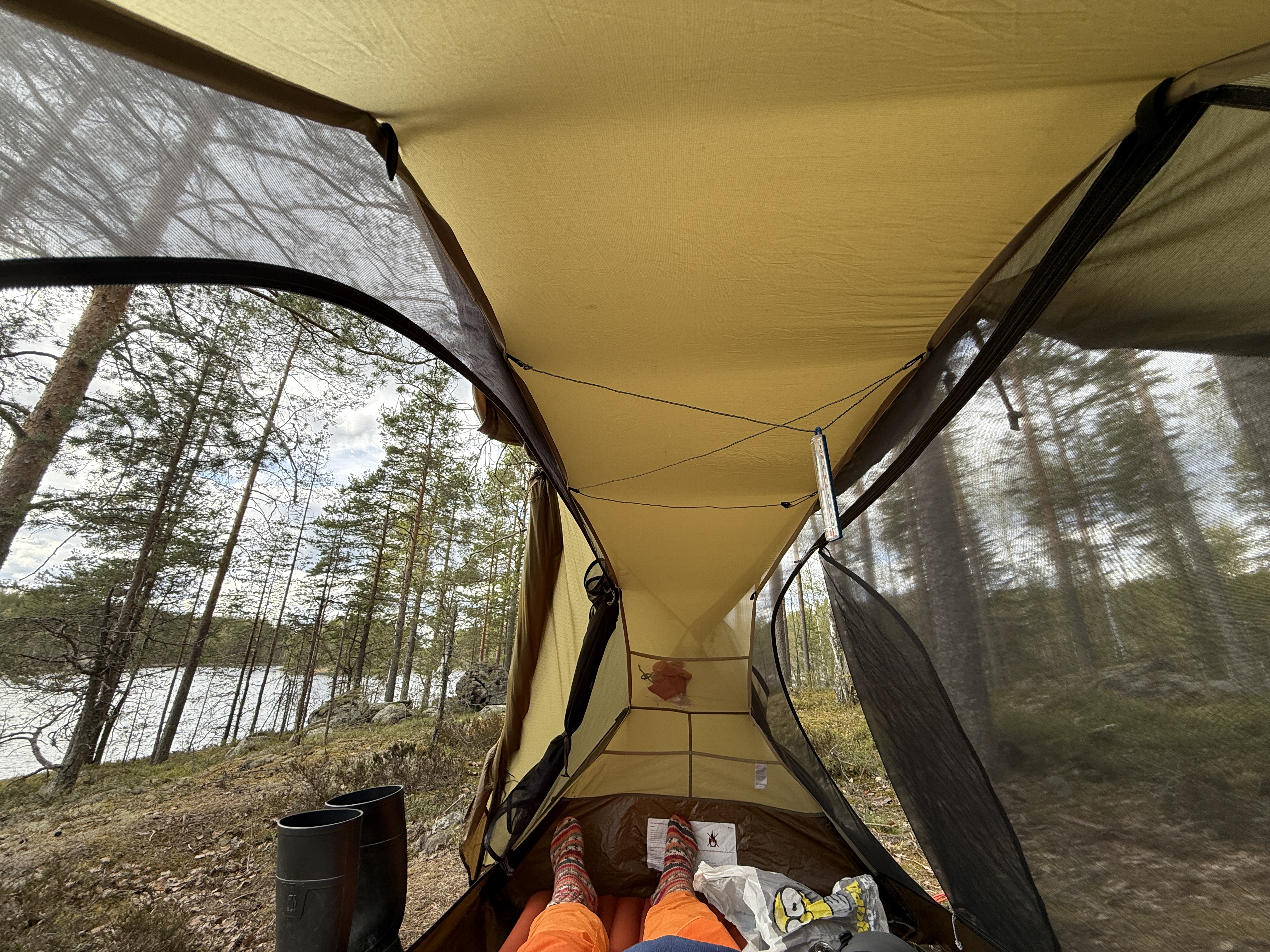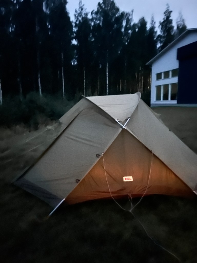 Keli oli hyvä ja lämmin. Lämmitin illalla kaminaa ihan pikkaisen. Mutta laitoin sen yhden klapin liikaa, vähän aikaa oli turhan lämmintä kämpässä. Ötököitä ilmaantui pikkasen kämpän ulkopuolelle iltasella, mutta ei paljon. Ja joo, nukuin kämpässä. Katselin telttapaikkoja kämpän ulkopuolelta mutta omaan makuuni sellaisia hyviä ei oikein löytynyt.
