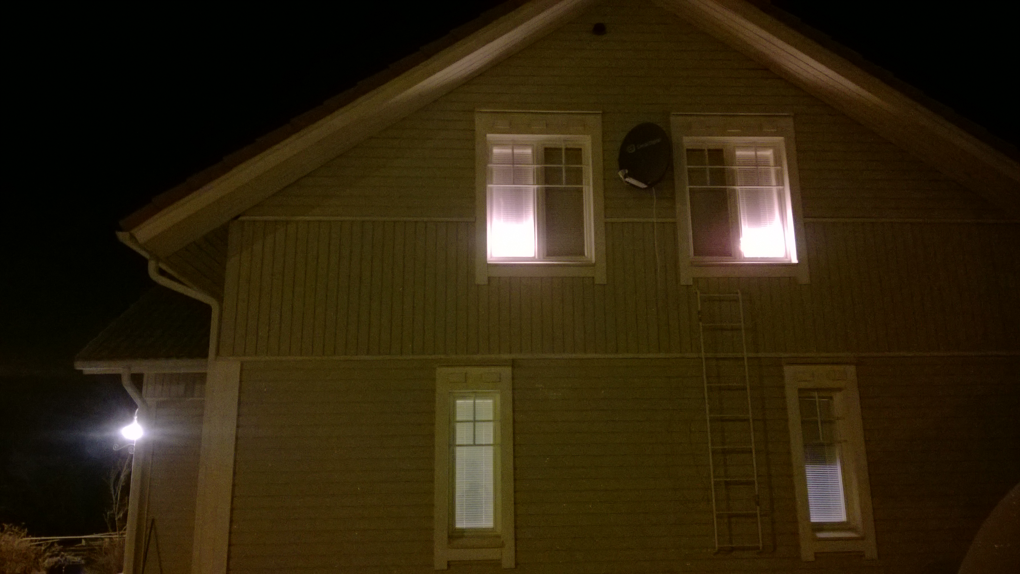 Jaahas, kyntteliköt on nyt viritelty ikkunoiden rakoon antamaan valoa ulos ja sisään. Aikaisempiin vuosiin verrattuna nyt lamput on automaattisesti säädetty sammumaan ja syttymään… Kehitysehdotus, kun seuraava talo tehdään niin sähkökeskuksessa täytyy olla ajastettuja pistorasioita valmiiksi (tai niin ainakin että ne ohjataan sähkökeskuksen kautta. Tai niin että jollain langattomalla laitteella….). Alla oleva kuva on otettu jollain Nokian 920 Lumialla…
