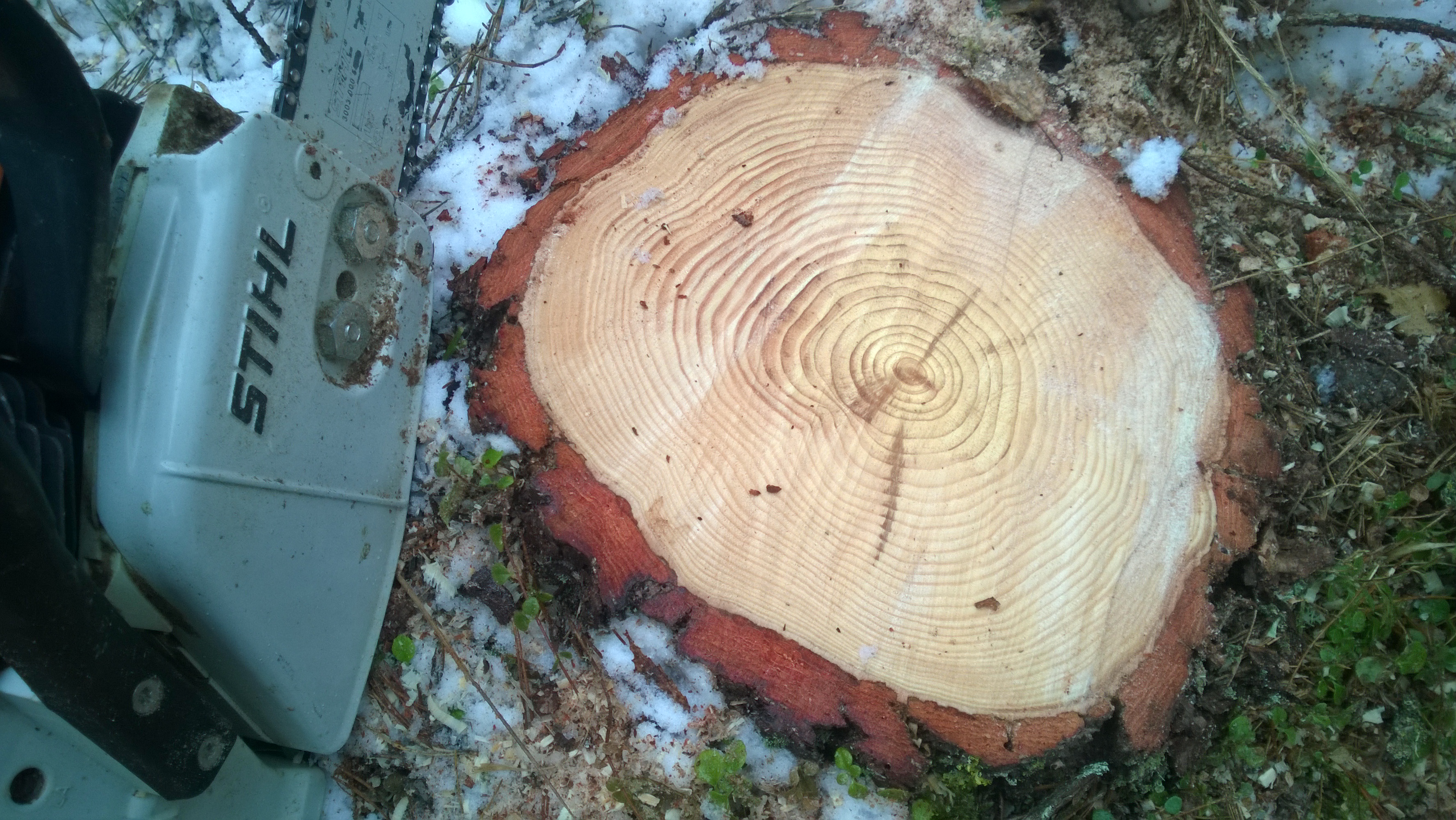 Melko tarkkaan juuri saman ikäinen mänty kuin sahaaja itse.