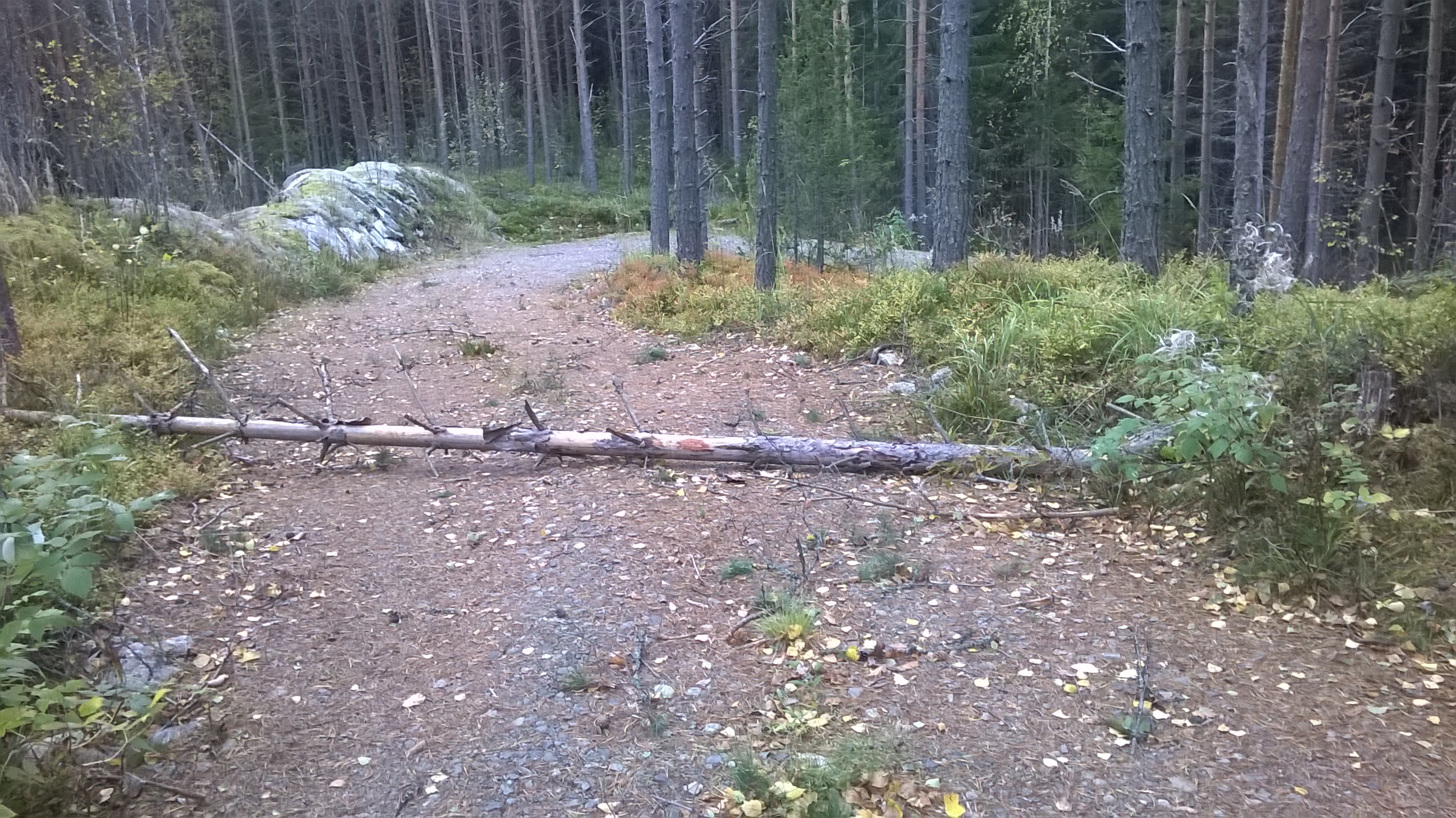 Mökillä syntyneet tuhot rajoittuivat tähän lahoon mäntyyn joka oli keskellä kulkutietä. Valio-myrsky kyllä sitten oli katkonut sähköt kaikilta niiltä naapureilta joilla sähkö toimitetaan ilmateitse kuparijohtoja pitkin.