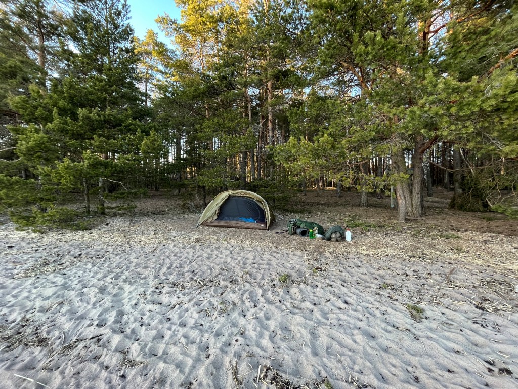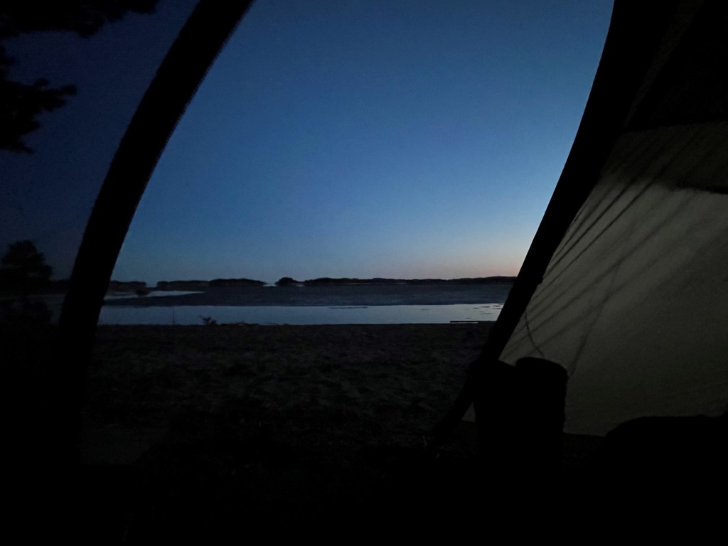 Leiripaikka oli taas sellainen varsin hieno, rantahietikon vierestä. Koska yöksi oli luvattu tyyntä keliä jätin sitten sivuoven ositttain auki mistä oli helppo seurailla yötaivasta.