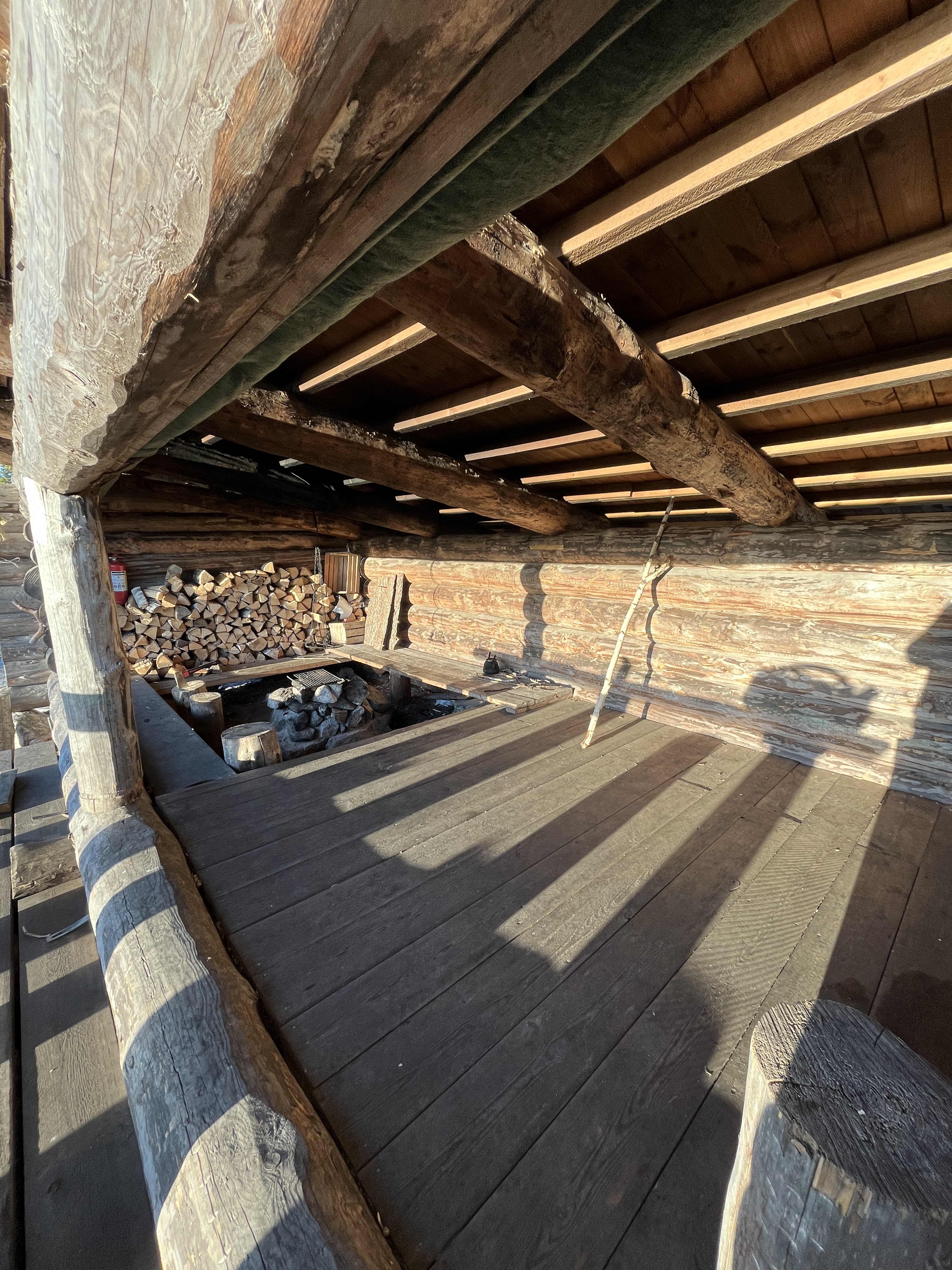 Erikoista on että Laavun sisällä on tulipaikka! Eli Laavu on kaksiosainen, tulipaikka ja huilipuoli.