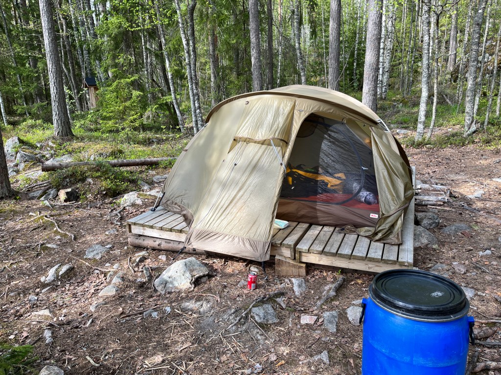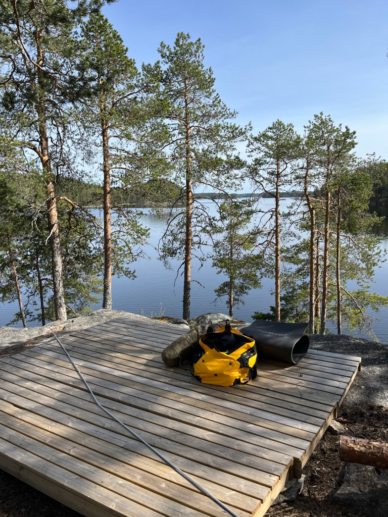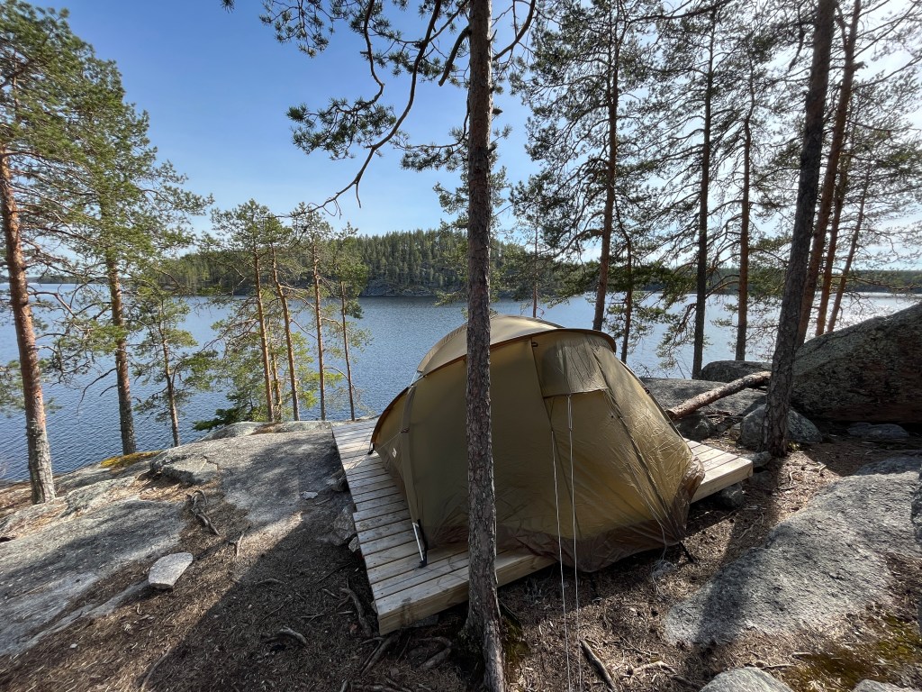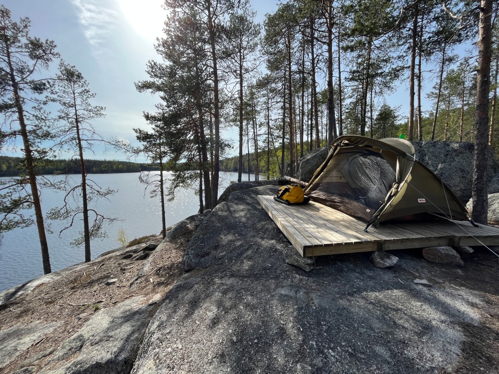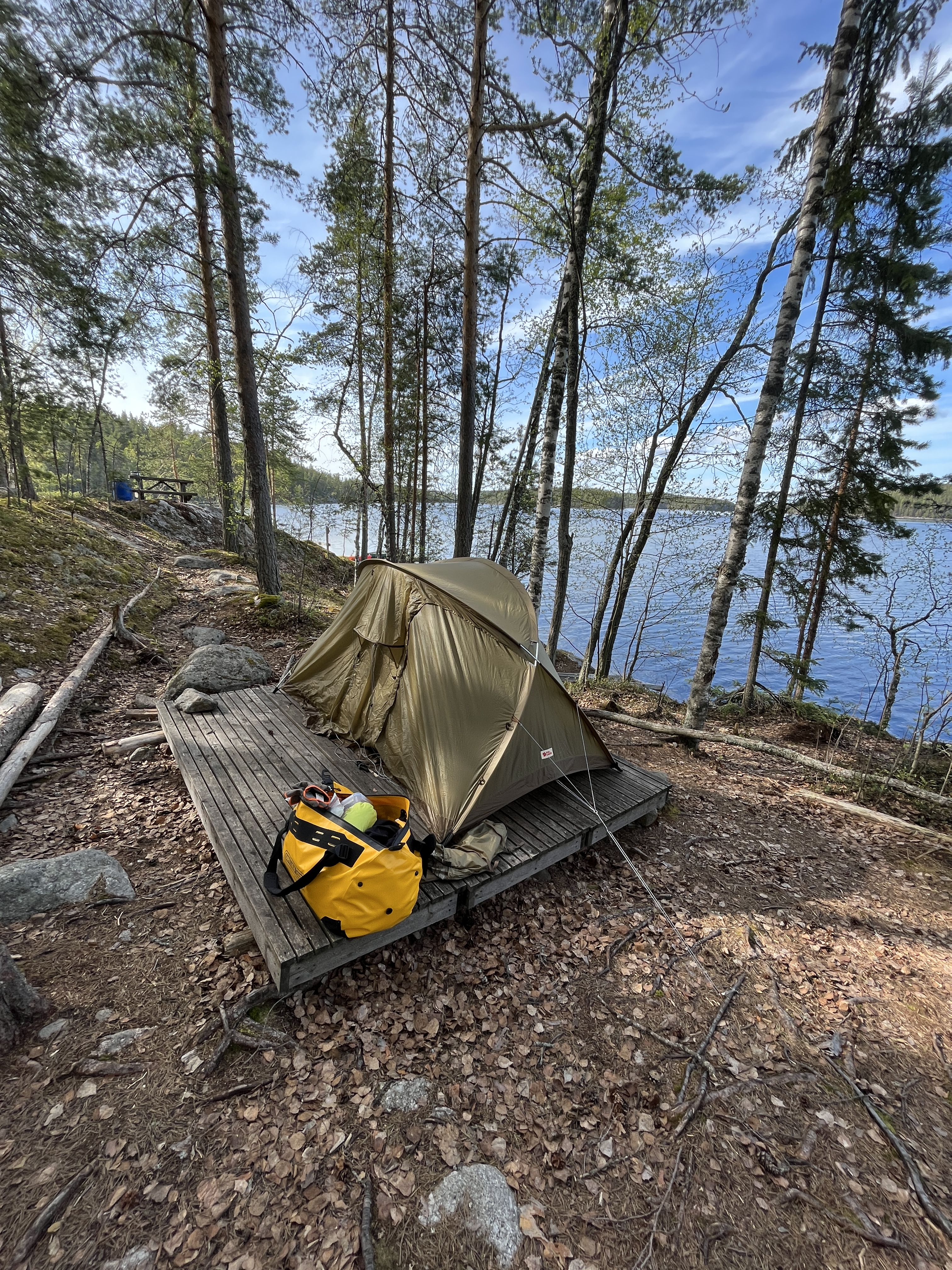 Syväniemestä ei ole pitkä matka Laajakaarteen leirintäalueelle. Laajakaarre on myös ”pieni” alue missä on kolmelle teltalle paikka. Ja enemmän paikkoja sitten riippareille. Tää oli sellainen nopea siirtymä päivä. Ja isoin homma oli syödä ruokavarastoja tyhjiksi. Ja miettiä millainen reissu onkaan ollut.