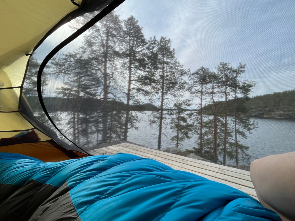 Aamukin avautui teltan ”ikkunasta” varsin mukavasti, pidin teltan sivun auki koko yön. Ja uni maittoi heti ekasta yöstä varsin hyvin, vaikka ei ollut Tempur tyynyä!