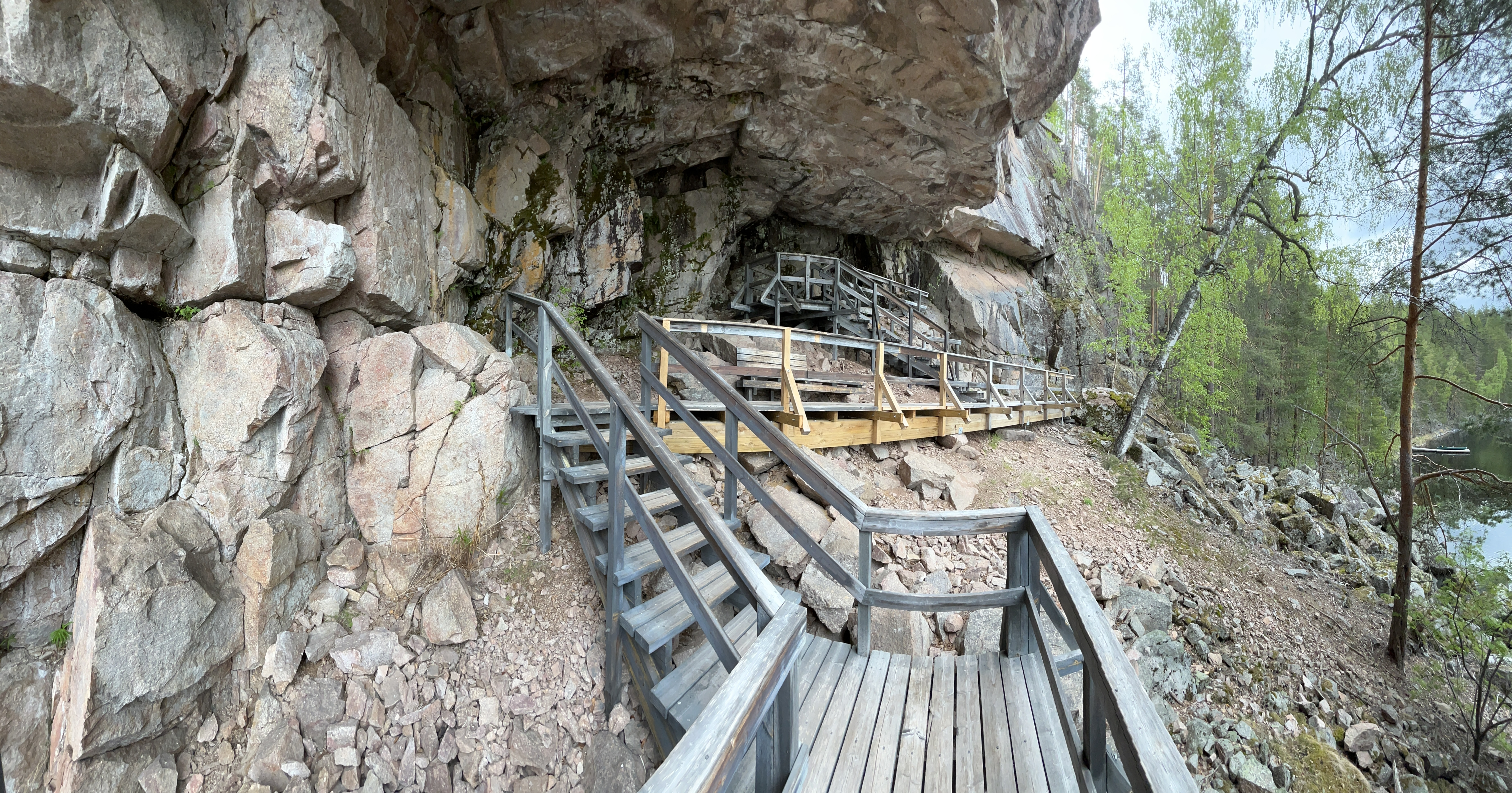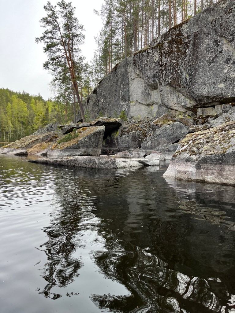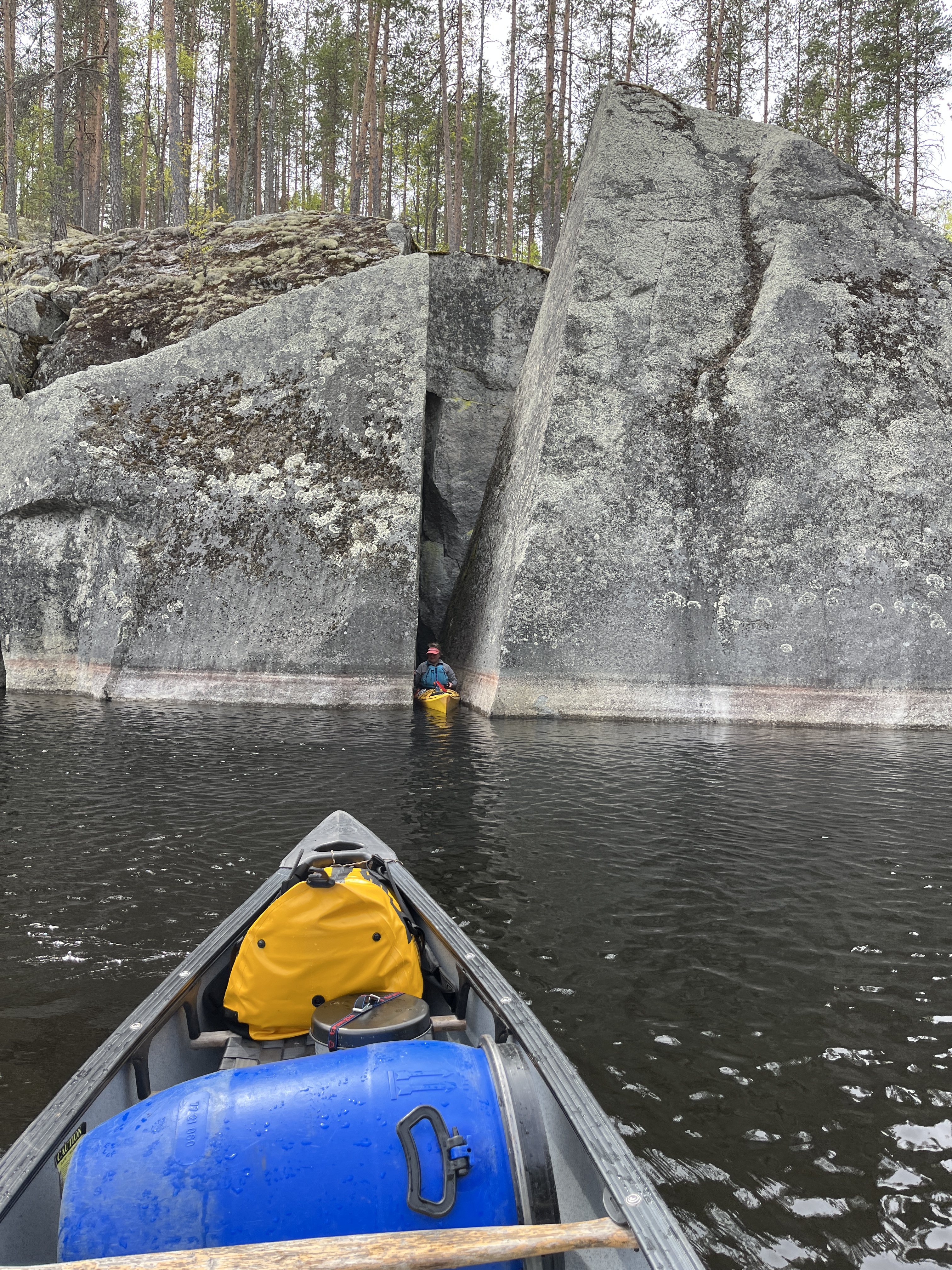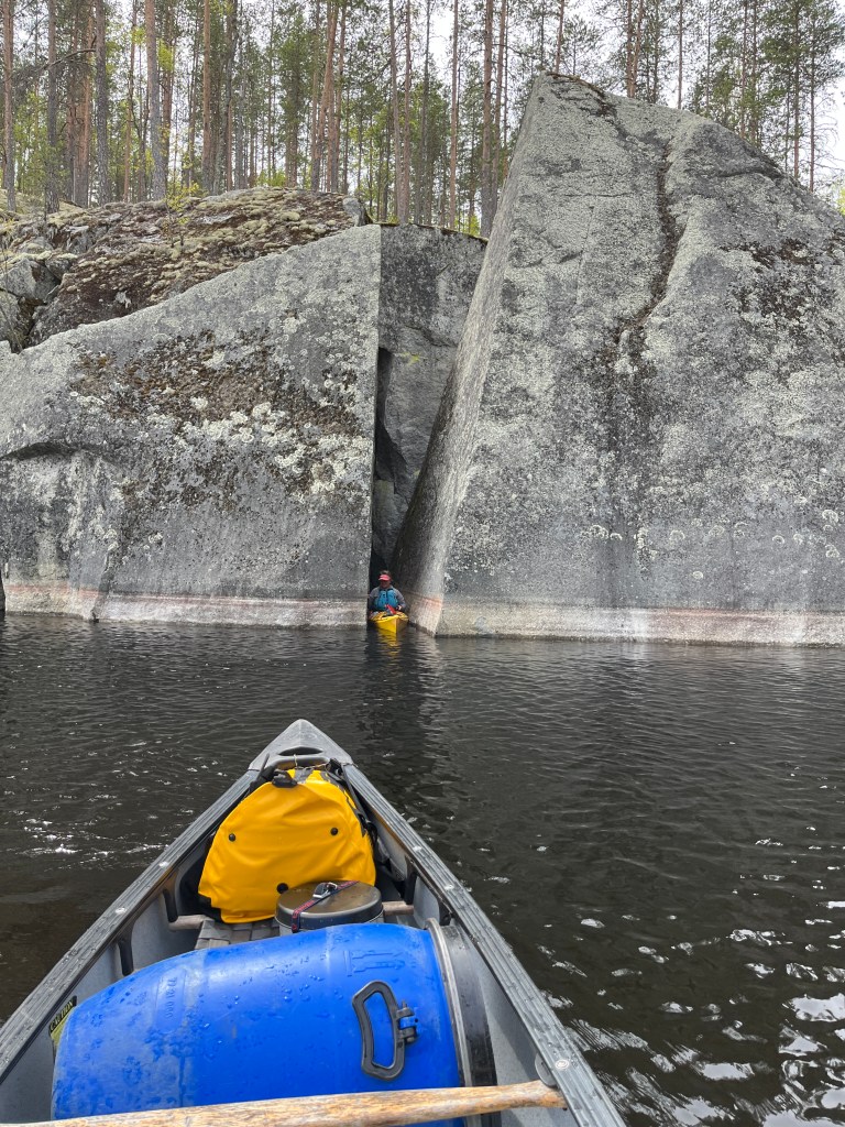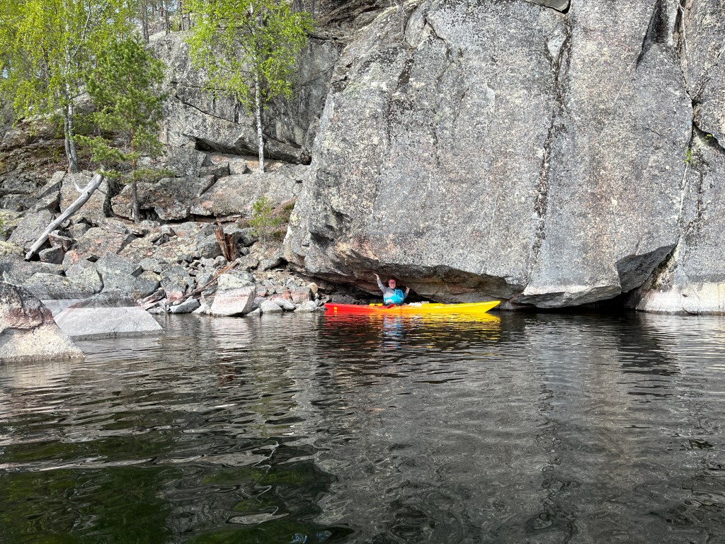 Ja tuolla olikin sitten Ukonkiven kupeessa mielenkiintoisia paikkoja. Sannan piti käydä kokeilee josko saisi kajakkinsa ängettyä kiven koloon.