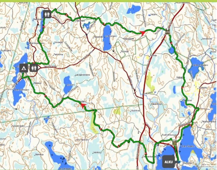 Tarkoitus olisi mennä reitti neljässä päivässä, 55km /4 = noin 14km/päivä. No tällee ”paperilla” ei paha mutta käytännössä??? Sit sen näkee.