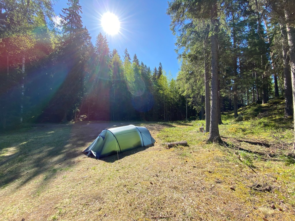 Kokalmuksessa vietin ekan yön. Päästyäni paikan päälle sain valita itse mihin telttani tällään ja tällä kertaa se paikka oli laavun takana olevan nyppylän päällä.